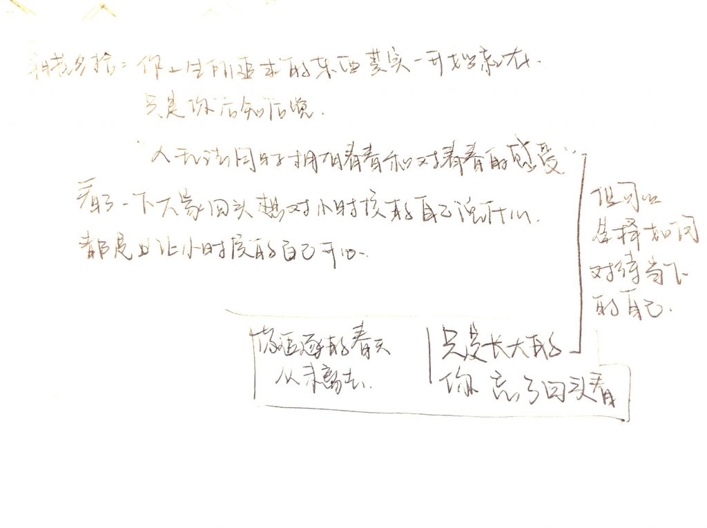 One cannot possess both youth and the feelings associated with it. However, you can choose how to deal with your current self. I actually put a lot of pressure on myself now because I feel that society and my peers have expectations for what we should achieve, and we also hope to achieve it ourselves. At the same time, there is also the comparison between ourselves and our peers. But when we look back at the novel, we will find that the things we were chasing have never really gone away; they have just grown older. We forgot to look back.